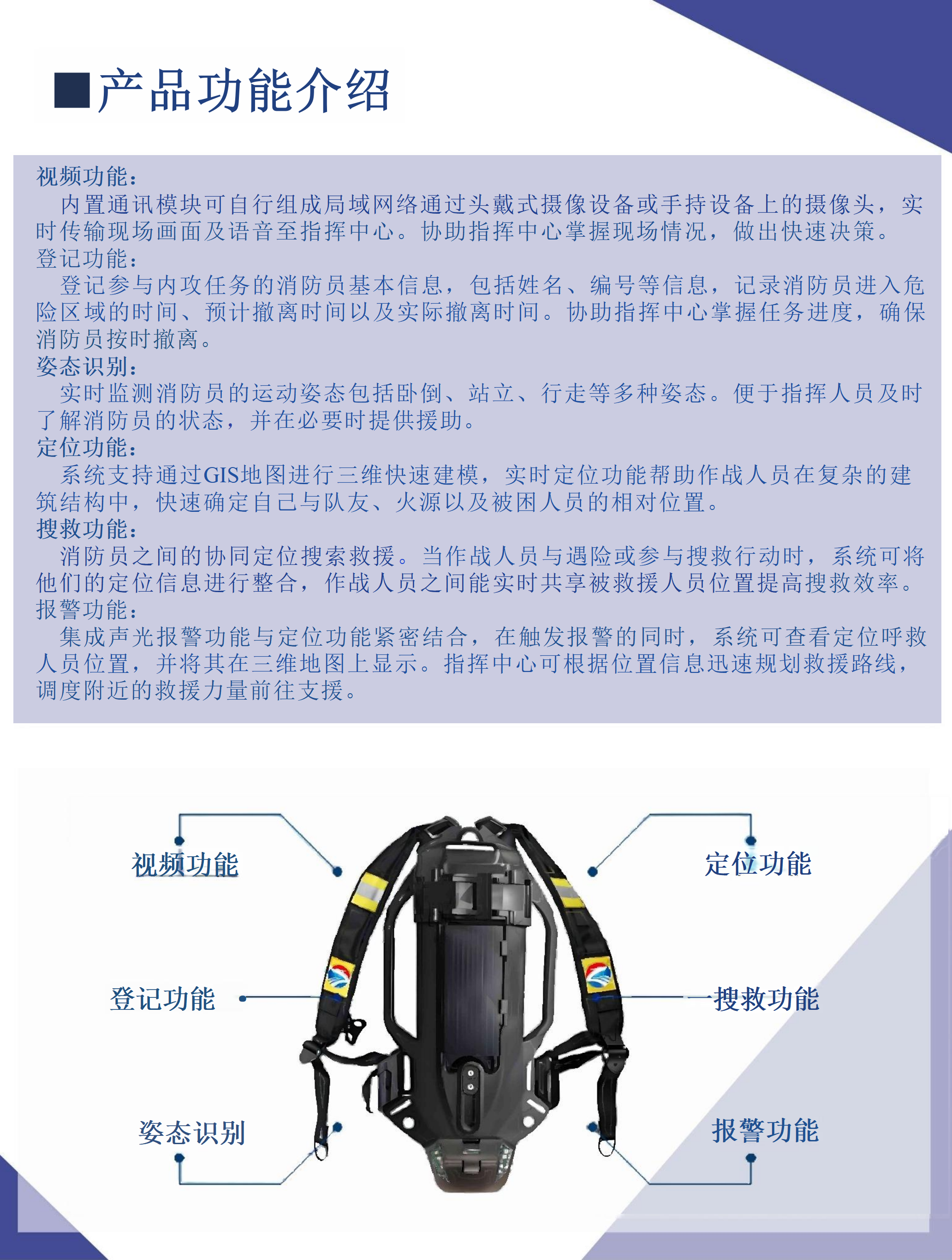 【超级单兵联战系统】是为解决现代化城市复杂建筑及重特大 自然灾害现场联合作战,通过集成多种先进技术,提供了从单兵 装备到指挥调度的全方位信息化支持,适用于复杂环境下的应 急救援和消防救援任务。其优势在于强大的环境适应性、实时 数据传输、智能化功能以及快速部署能力,能够显著提升救援 效率和作战协同能力。