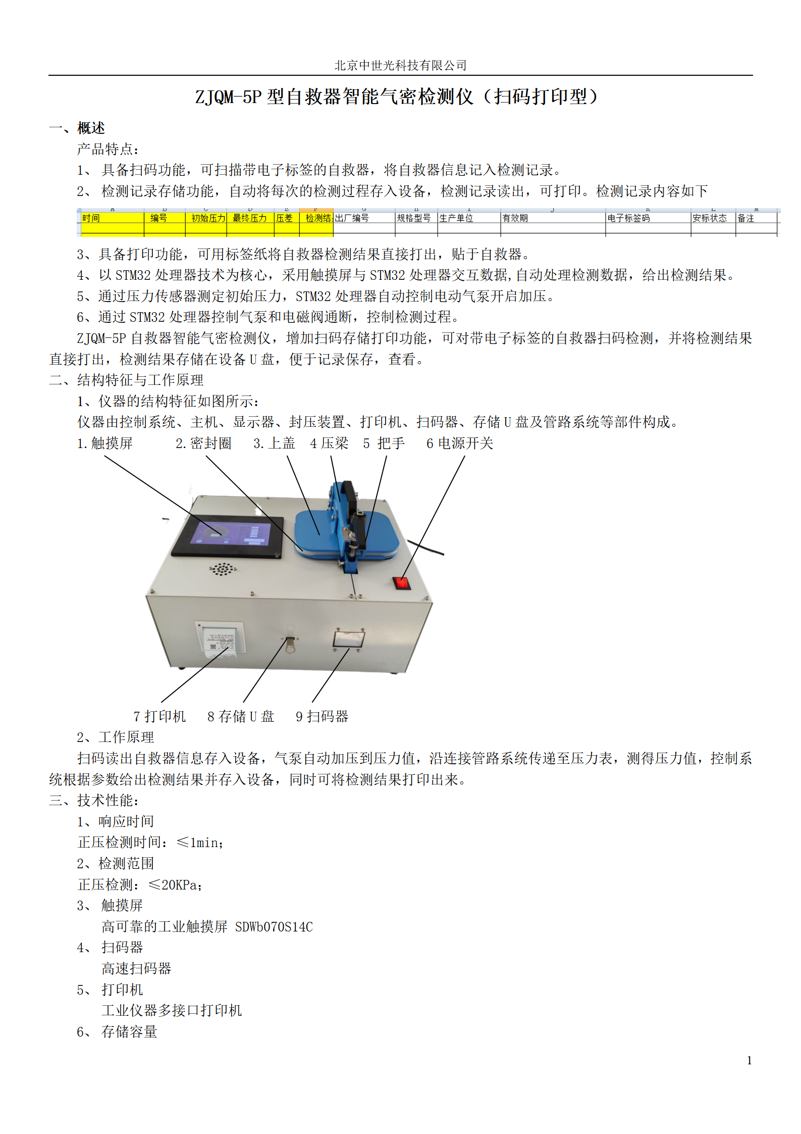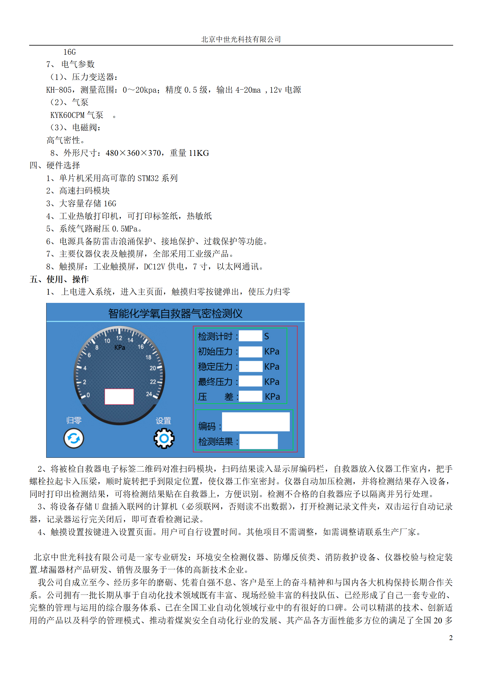 扫码读出自救器信息存入设备,气泵自动加压到压力值,沿连接管路系统传递至压力表,测得压力值,控制系统根据参数给出检测结果并存入设备,同时可将检测结果打印出来。