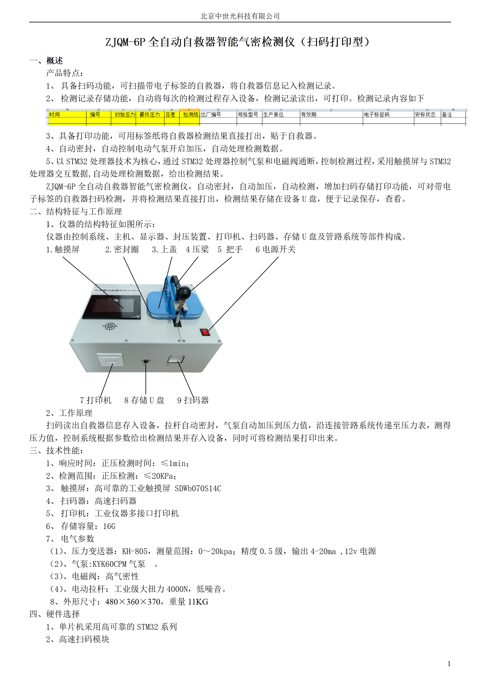 本装置为化学氧自救器的一种自动检测设备,相较现有的检测方式,本设备可快速高效的检测化学氧自救器气密性,能同时检测6台化学氧自救器气密性。触摸操作,一键自动加压,到达设定压力值时自动停止,自动计时,根据压差自动判断检测结果。