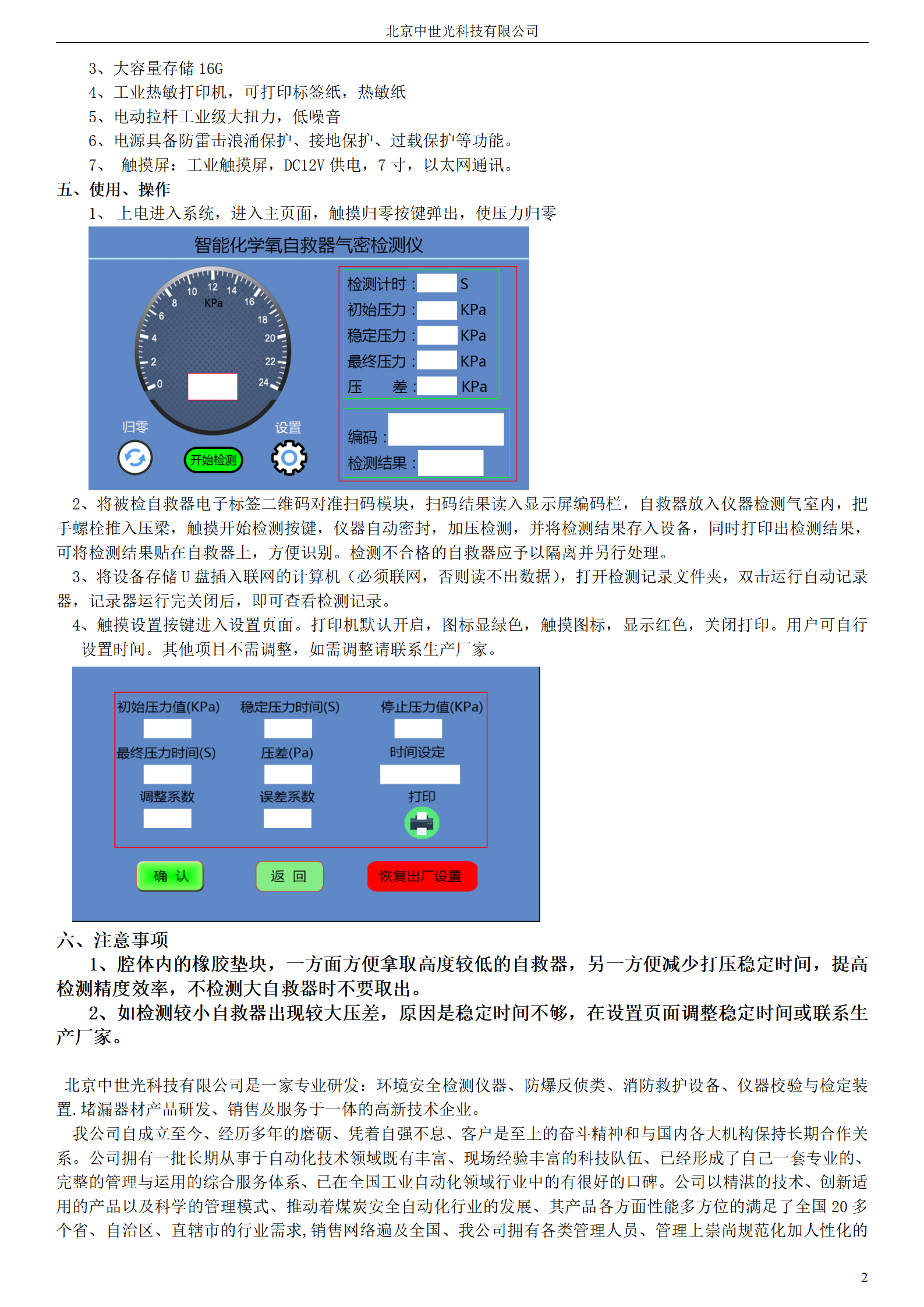 ★1、用于化学氧自救器的智能检测设备,具有同时完成6个自救器的检查功能,采用分腔、分检模式, 6个检测腔,自动处理检测数据,给出检测结果,检查结果不合格提示。
