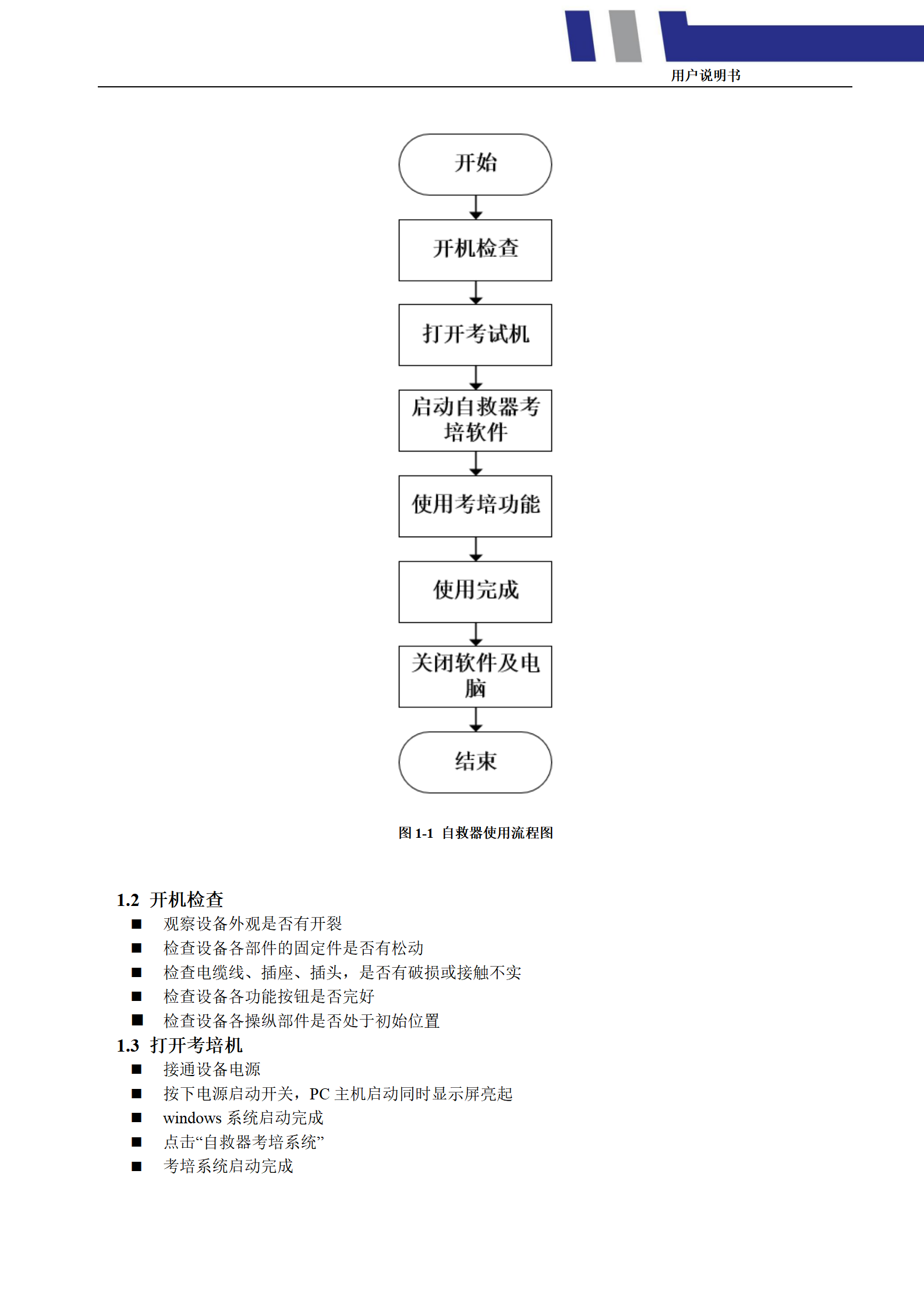 矿用自救器实操考培系统启动及关闭共分为6个步骤,首先使用前检查硬件设备是否正常,有服务器版先开启服务器电源,然后开启考试机下部电源,启动屏下考试机电源。单机不含服务器版可跳过服务器开启过程。最后等待打开完成后点击考试机屏幕上的自救器考培软件并等待软件启动。使用完成后需要先关闭考培软件和服务器再关闭考试机,关闭考试机需要通过鼠标点击左下方电脑中的关机按钮完成关机。使用流程图如图1-1所示。