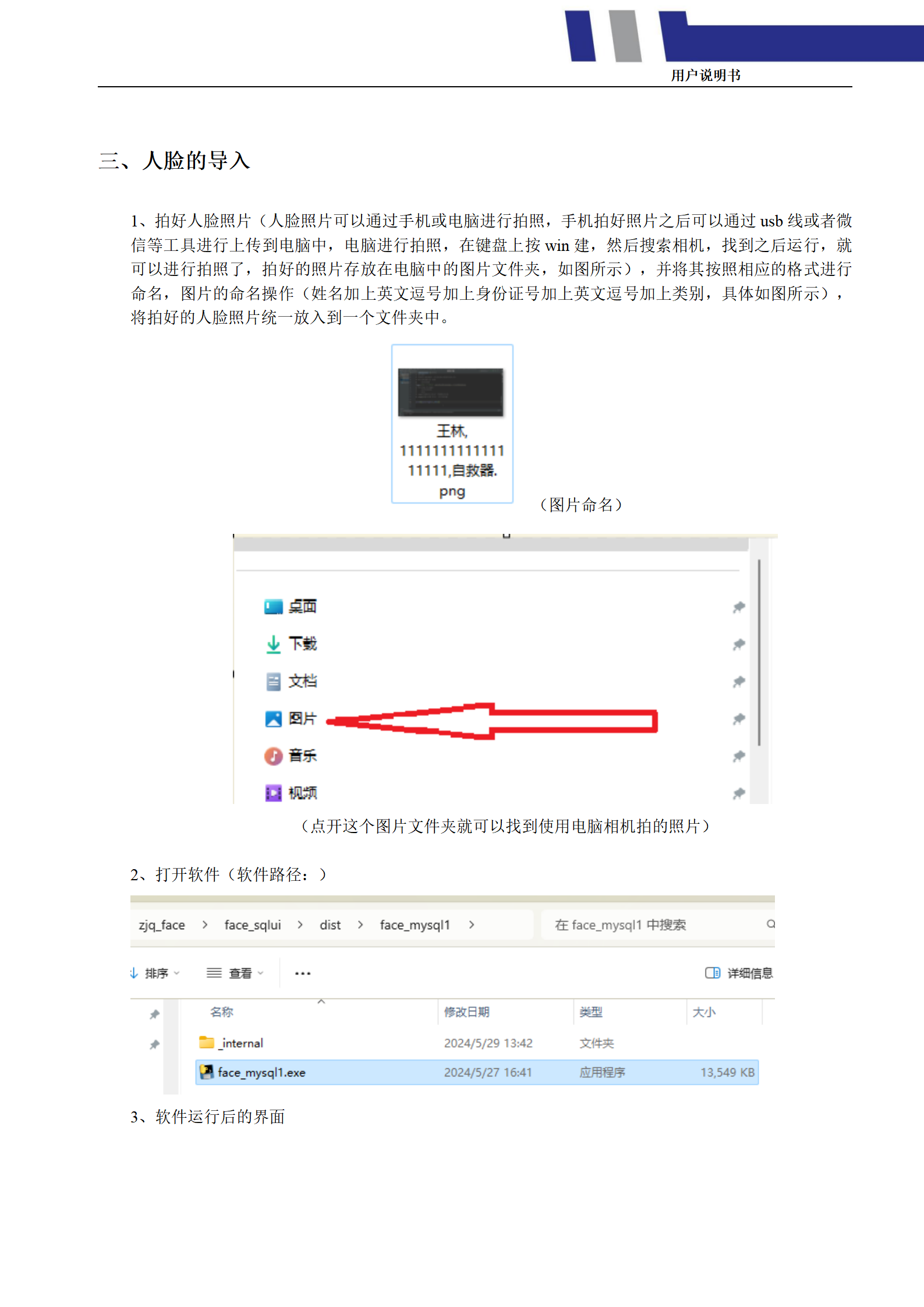 1、拍好人脸照片(人脸照片可以通过手机或电脑进行拍照,手机拍好照片之后可以通过usb线或者微信等工具进行上传到电脑中,电脑进行拍照,在键盘上按win建,然后搜索相机,找到之后运行,就可以进行拍照了,拍好的照片存放在电脑中的图片文件夹,如图所示),并将其按照相应的格式进行命名,图片的命名操作(姓名加上英文逗号加上身份证号加上英文逗号加上类别,具体如图所示),将拍好的人脸照片统一放入到一个文件夹中。