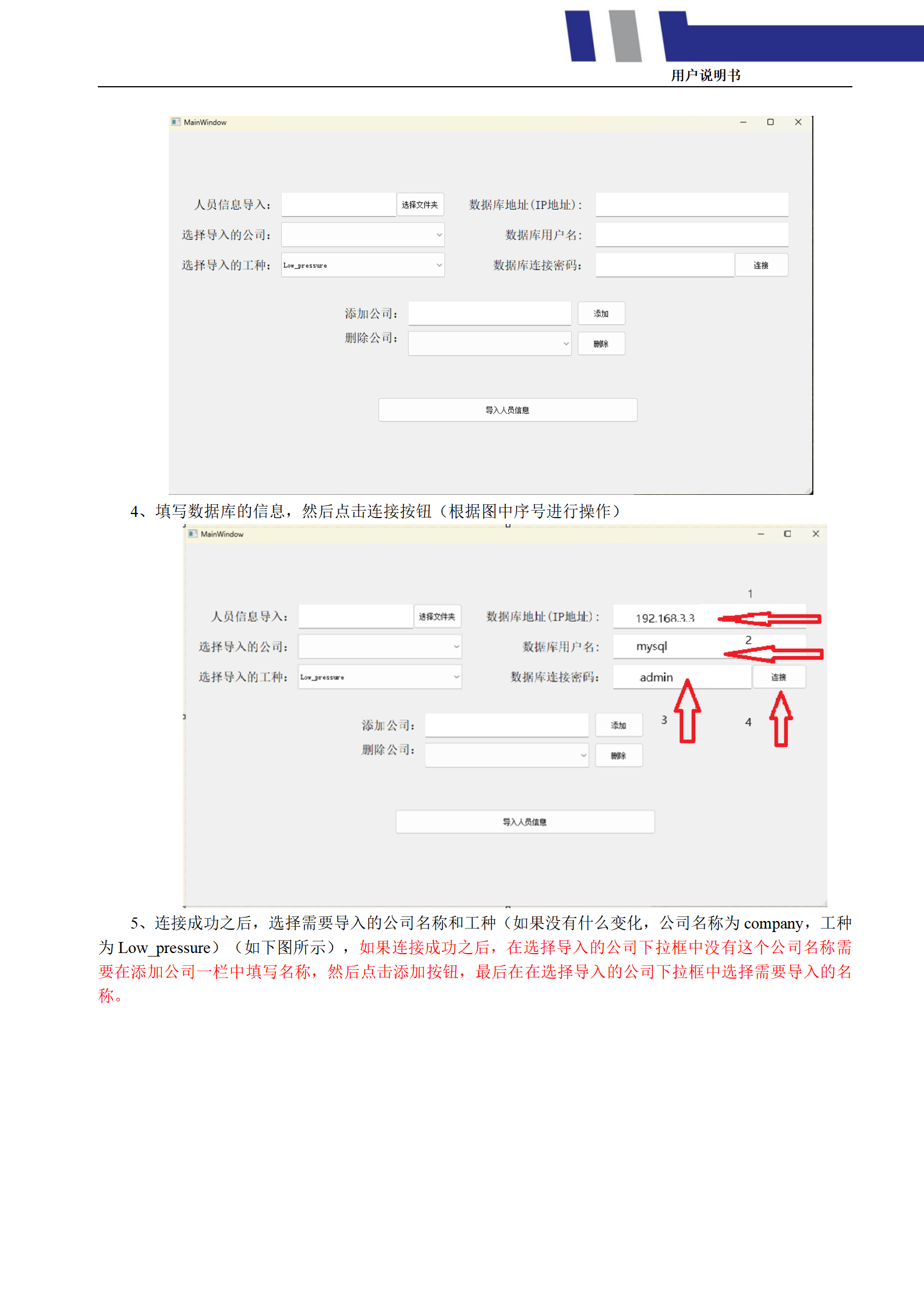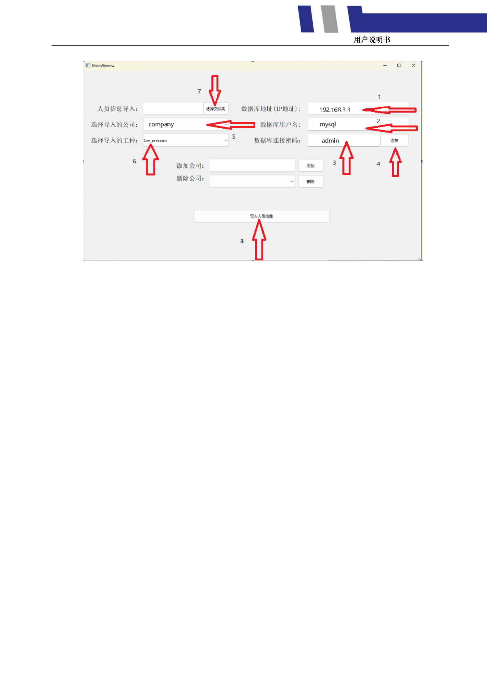 5、连接成功之后,选择需要导入的公司名称和工种(如果没有什么变化,公司名称为company,工种为Low_pressure)(如下图所示),如果连接成功之后,在选择导入的公司下拉框中没有这个公司名称需要在添加公司一栏中填写名称,然后点击添加按钮,最后在在选择导入的公司下拉框中选择需要导入的名称。